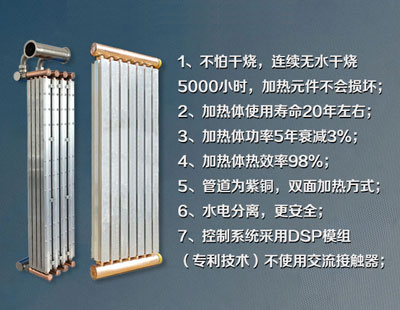 成功研發升級至第六代全新智能沈陽全導體電鍋爐機組。產品采用全導體加熱變頻技術,節能設計,熱效率高達98%以上,水電分離,獨有的故障自檢,防凍防干燒等十大保護;不使用交流接觸器,采用DSP控制模組、工作無聲音,不怕潮濕;采用國內正泰原裝配件,穩定耐用,智能控制,功率衰減小,比傳統沈陽電鍋爐節能30%以上“公司能夠生產單機500-6000千瓦大型電鍋爐、大功率電鍋爐、大型工業電鍋爐、大型電加熱鍋爐”